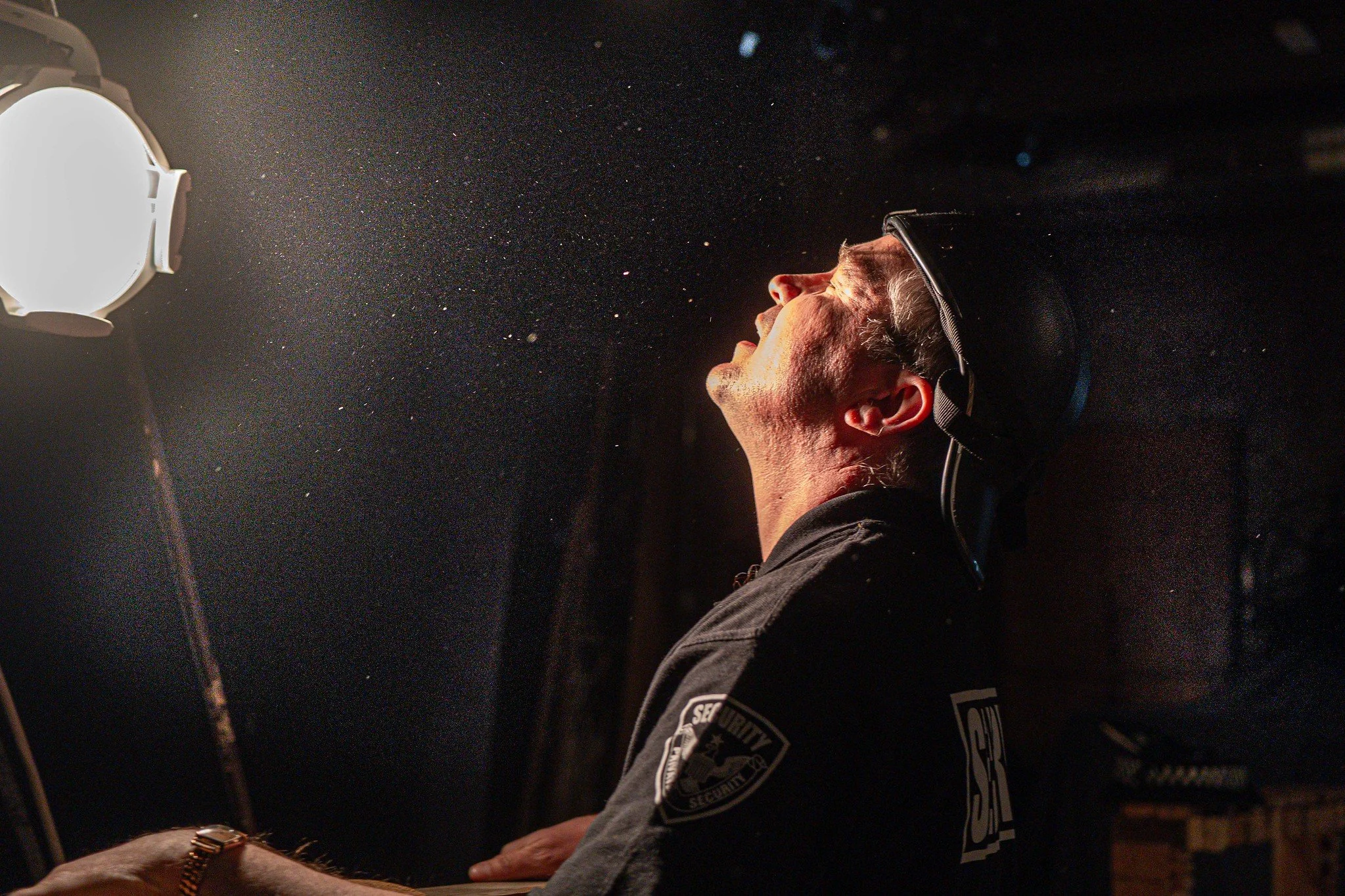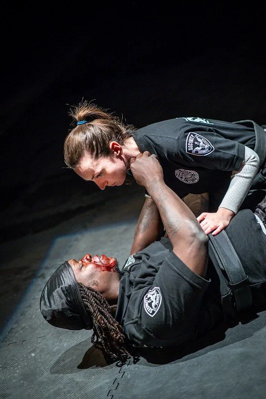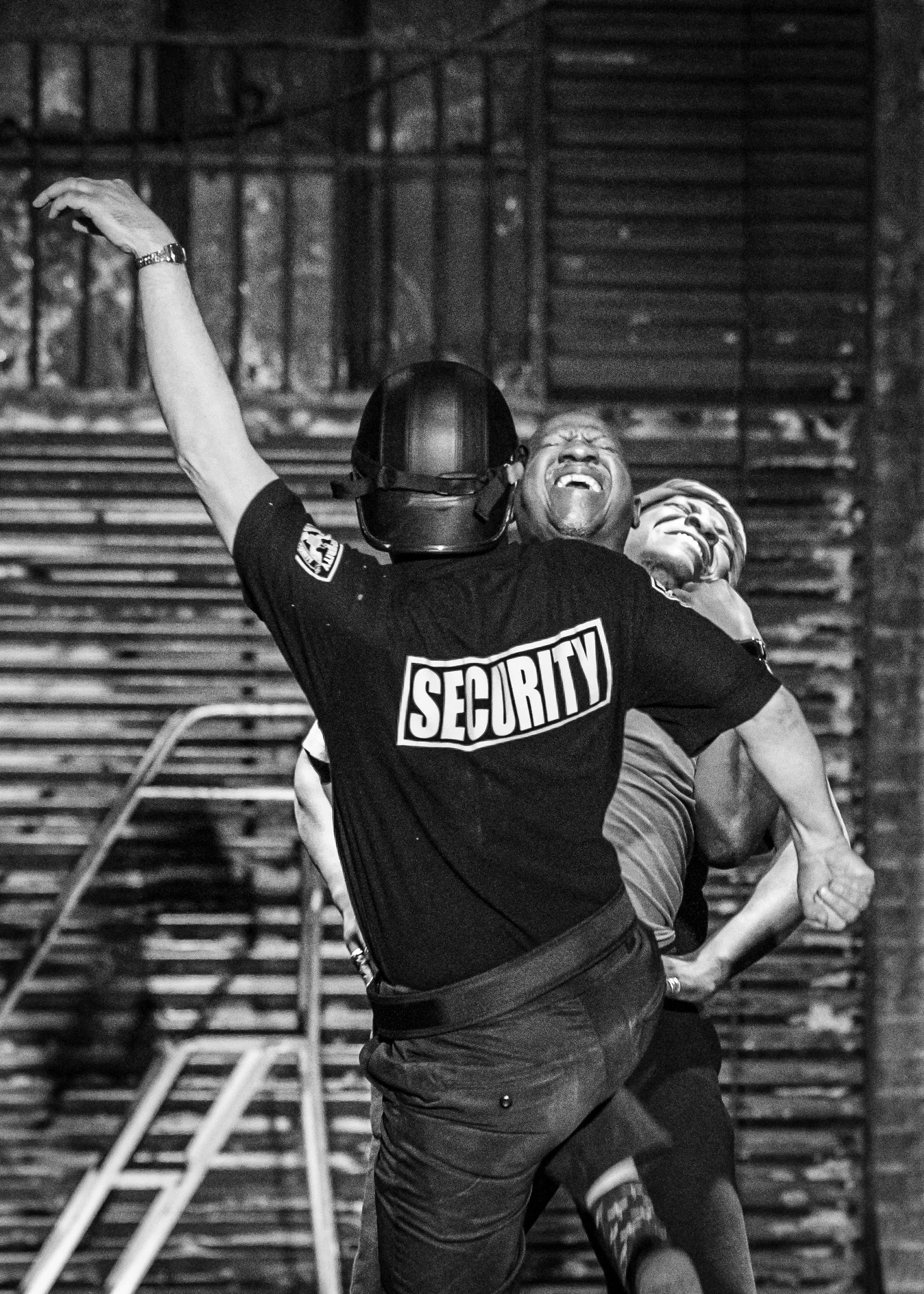 In Theatre Y’s concept, the audience is the “object” of the security team’s protection, treated as if they have come to seek refuge from the menace of the outside world. The theater becomes a disorienting holding-pen in which actors and audience together wait out the danger. Director Melissa Lorraine invites vulnerability into this satire, and a feminine relationship to violence.